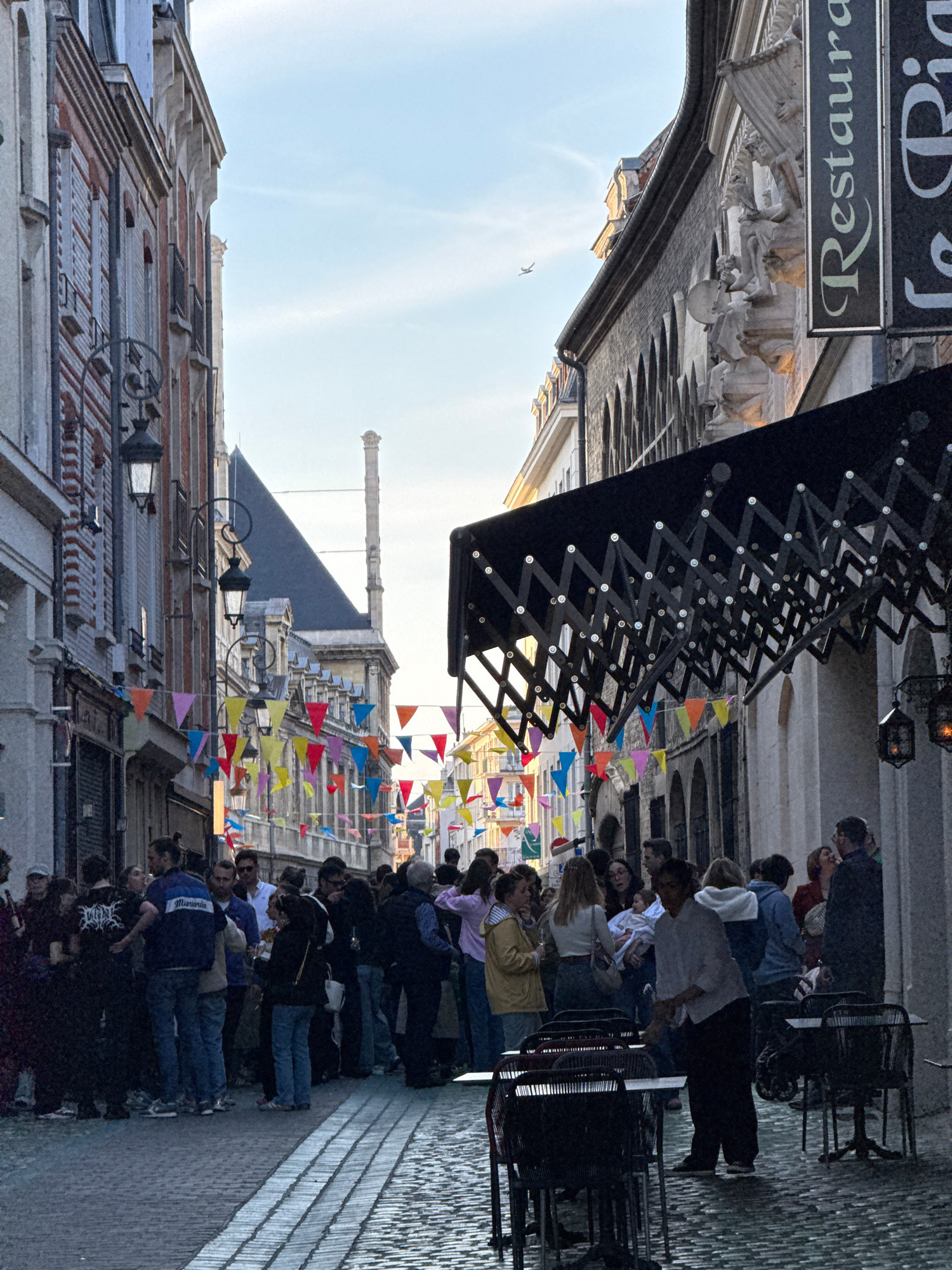 The image shows a bustling pedestrian street scene in Reims, France. A dense crowd of people is visible, primarily on the right side of the frame, suggesting a possible event or attraction. Many color…read more