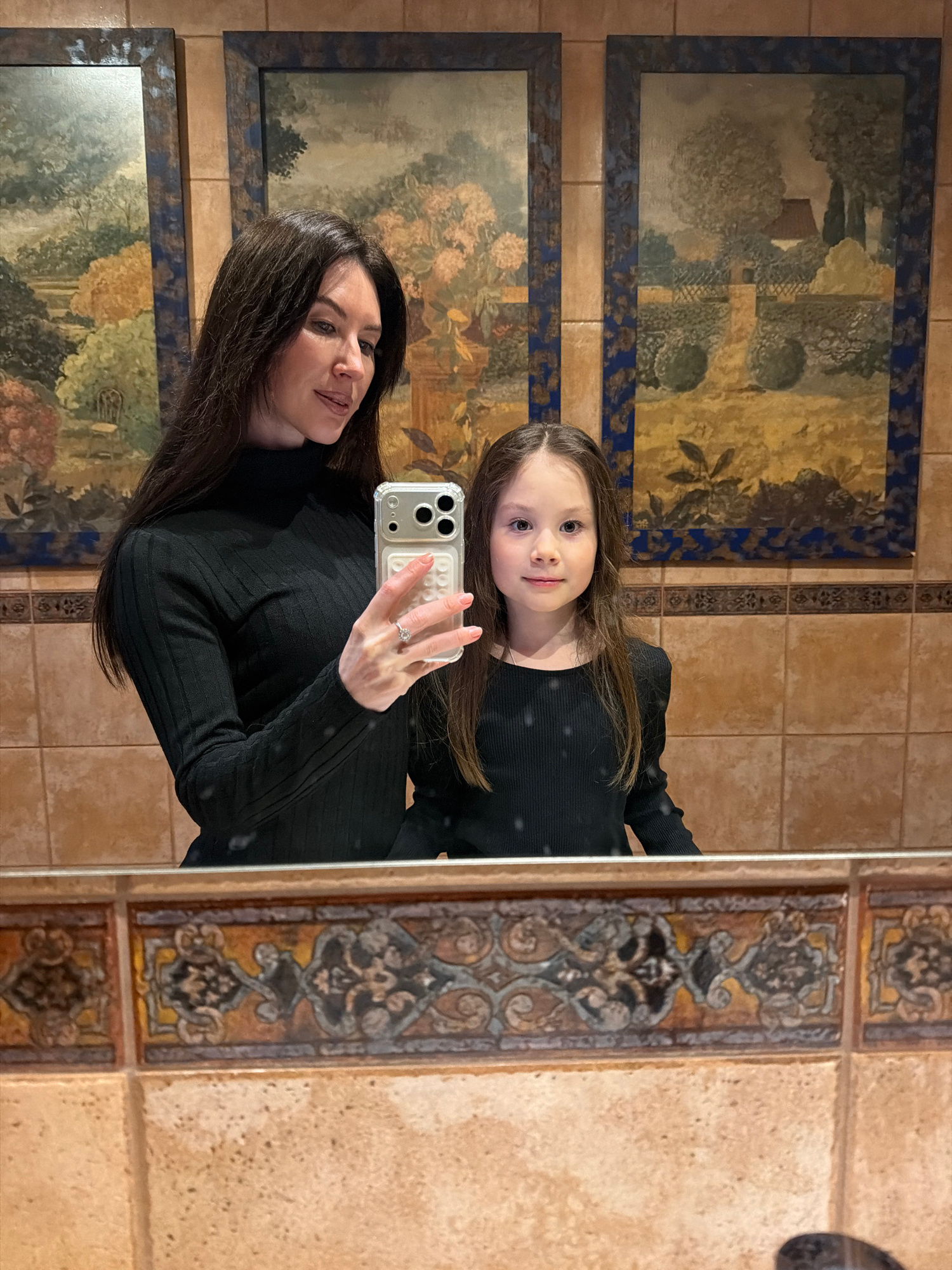 A woman and a young girl are visible in a mirror selfie. Both are wearing black clothing. The woman is holding a phone with a clear case and multiple lenses, seemingly taking the picture. The backgrou…read more