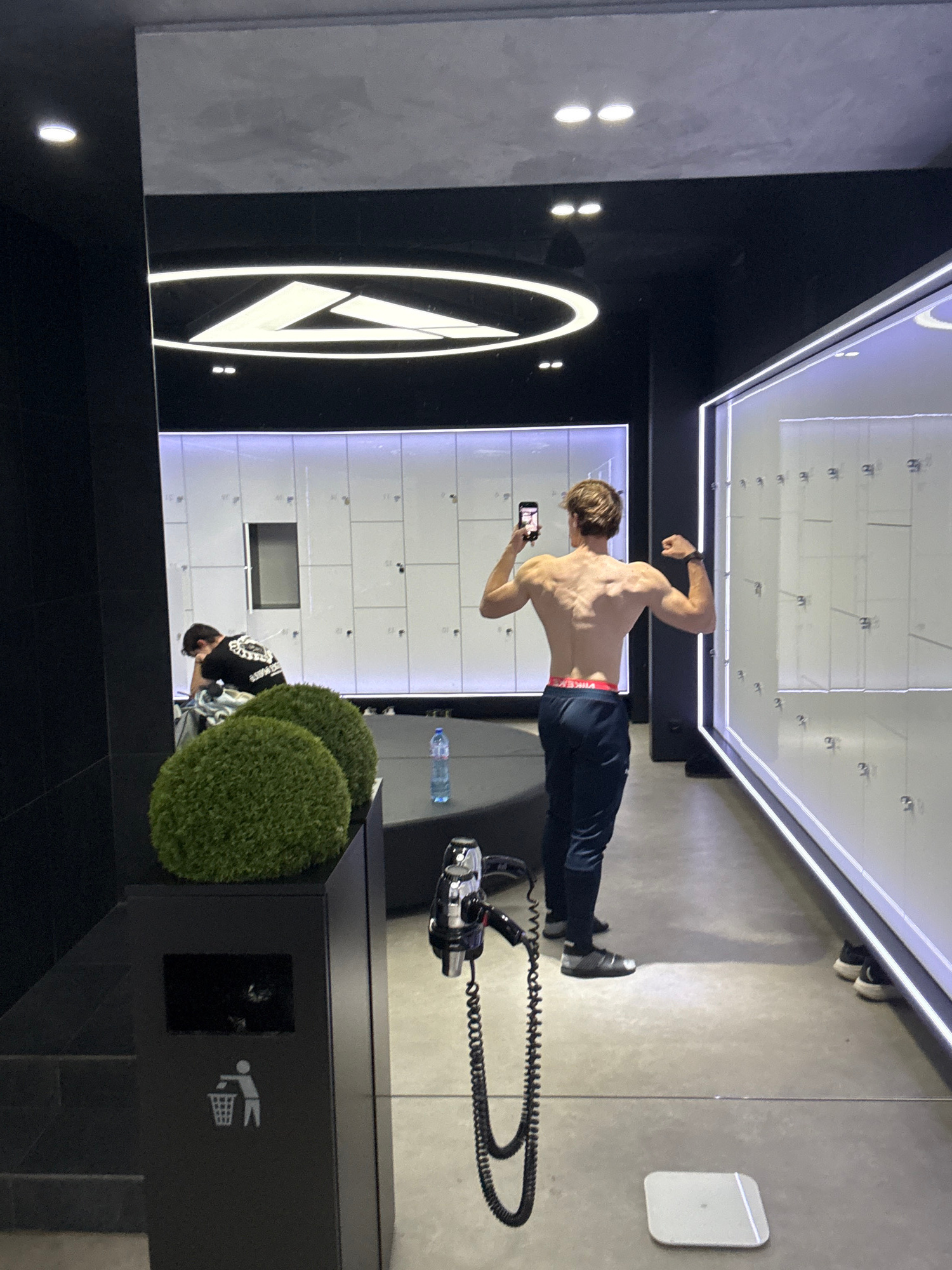The image depicts a modern indoor facility, likely a gym or changing area. The perspective is tilted, making the floor appear as a wall. The main subject is a shirtless man with a well-defined, muscu…read more