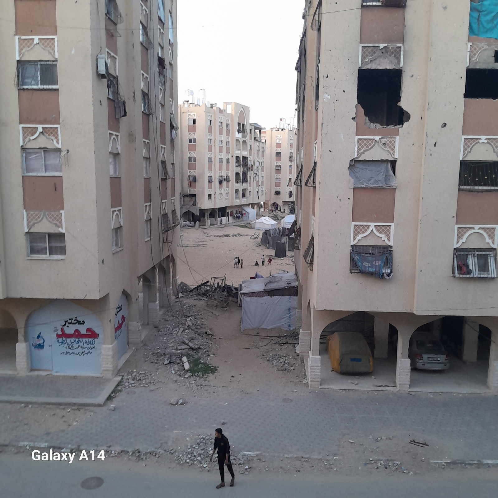 The image depicts an urban scene in Khan Yunis, Palestinian Territory, characterized by damaged buildings and makeshift shelters. The buildings show signs of significant damage, including broken windoβ¦read more