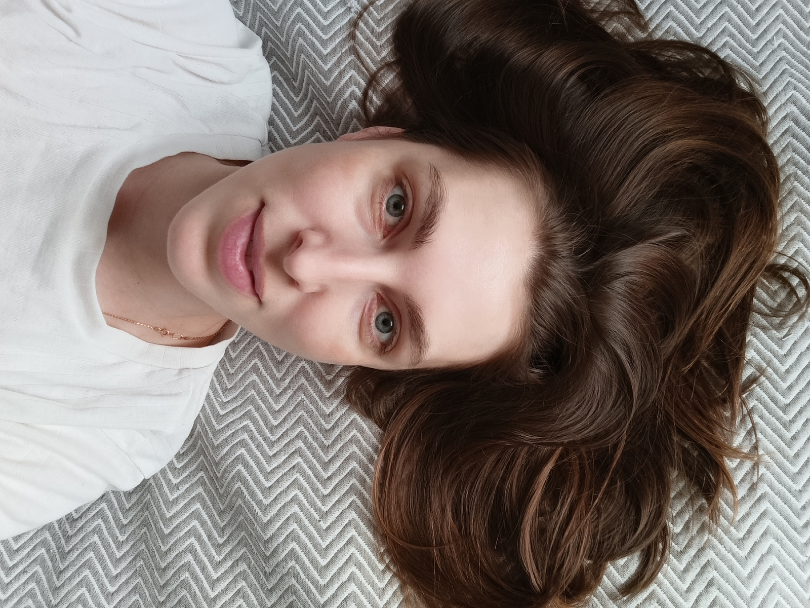 A young woman with long, auburn hair is lying on a gray and white zigzag-patterned surface. She is wearing a white shirt and a delicate gold necklace. She is looking directly at the camera with a slig…read more