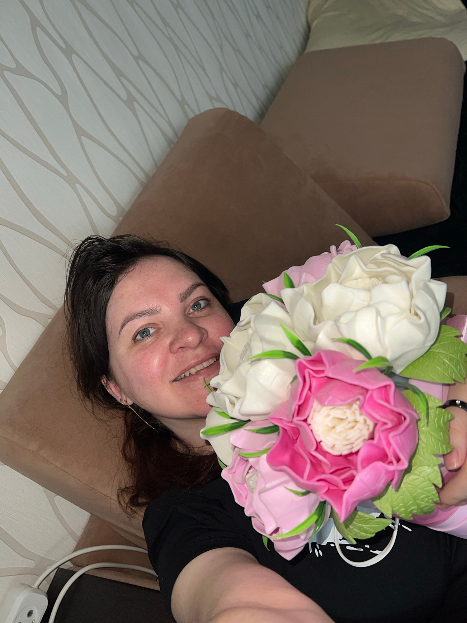 A woman is lying on a taupe pillow on a white patterned surface. She holds a bouquet of white and pink flowers in front of her face. She has blue eyes and dark hair. The background includes a brown co…read more