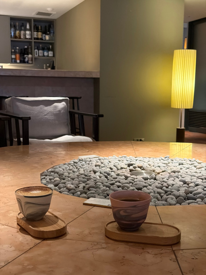 The image displays a uniquely decorated wall with round decorative stone elements, upon which two decorative bowls rest on wooden platforms. One bowl is pink and gray, the other is white and gray. In…read more