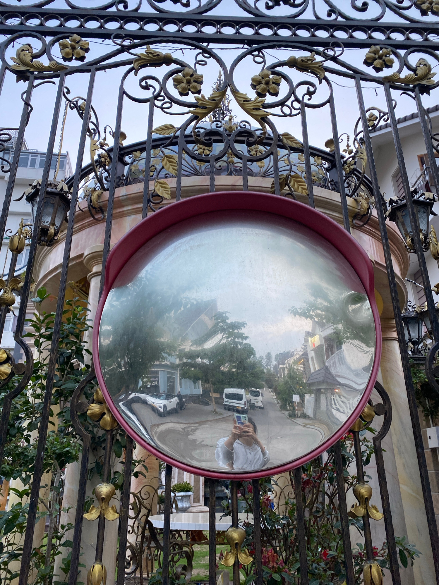 A convex security mirror with a red frame is attached to a black wrought-iron gate. The gate is adorned with gold-colored floral motifs and has green foliage growing around it. The mirror reflects a s…read more