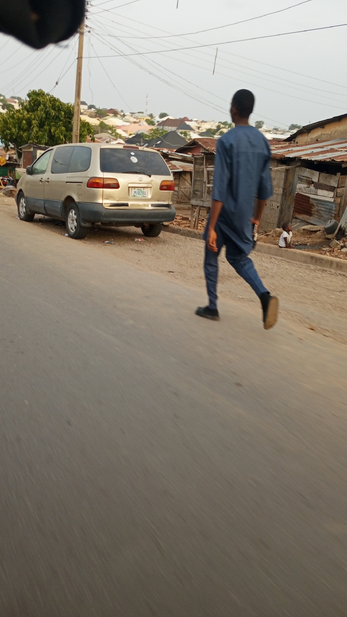 The image shows a street scene in Lokoja, Nigeria. A gold Toyota Sienna minivan is parked on the side of the road. A man in a blue outfit is walking away from the van and down the road. A child is sit…read more