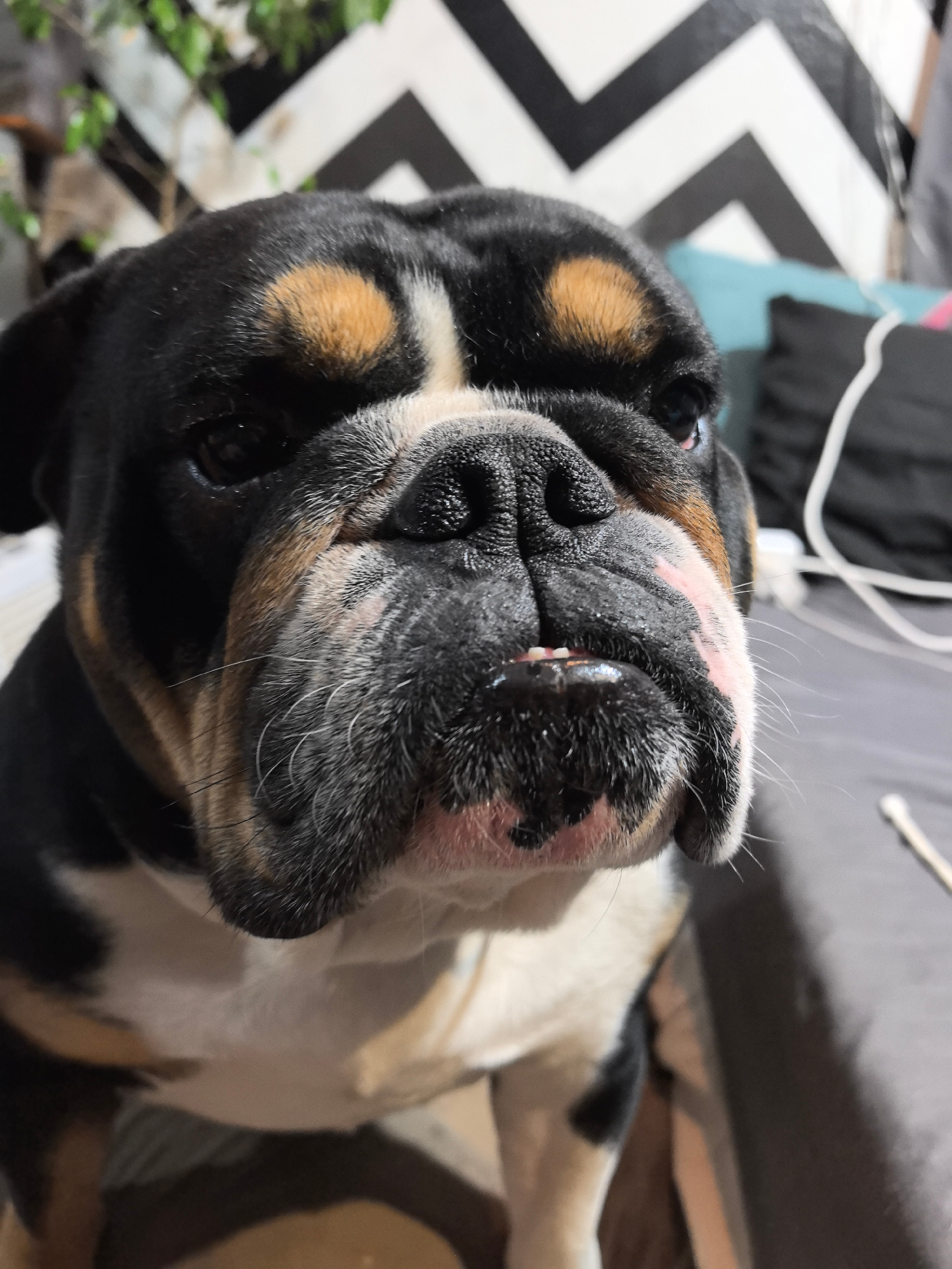 A close-up shot of an English Bulldog. The dog has black fur on its head, with tan patches above the eyes and white fur on its chest. The background consists of a black and white chevron patterned walβ¦read more