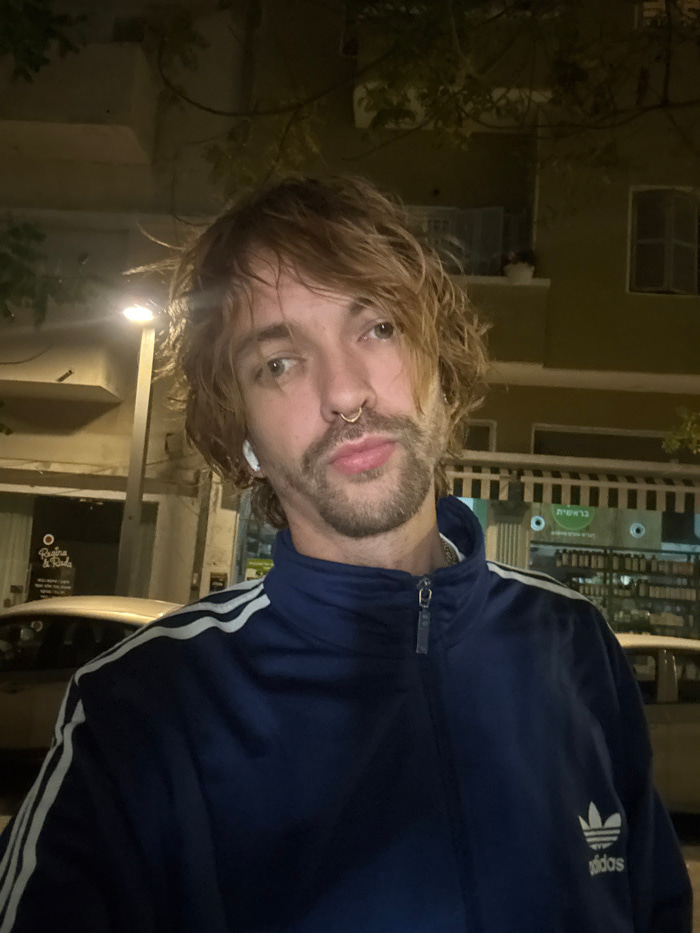 A man with blonde, wavy hair and a trimmed beard faces the camera, sporting a nose ring and earbuds. He wears a blue Adidas tracksuit with white stripes. The background features a building at night, i…read more