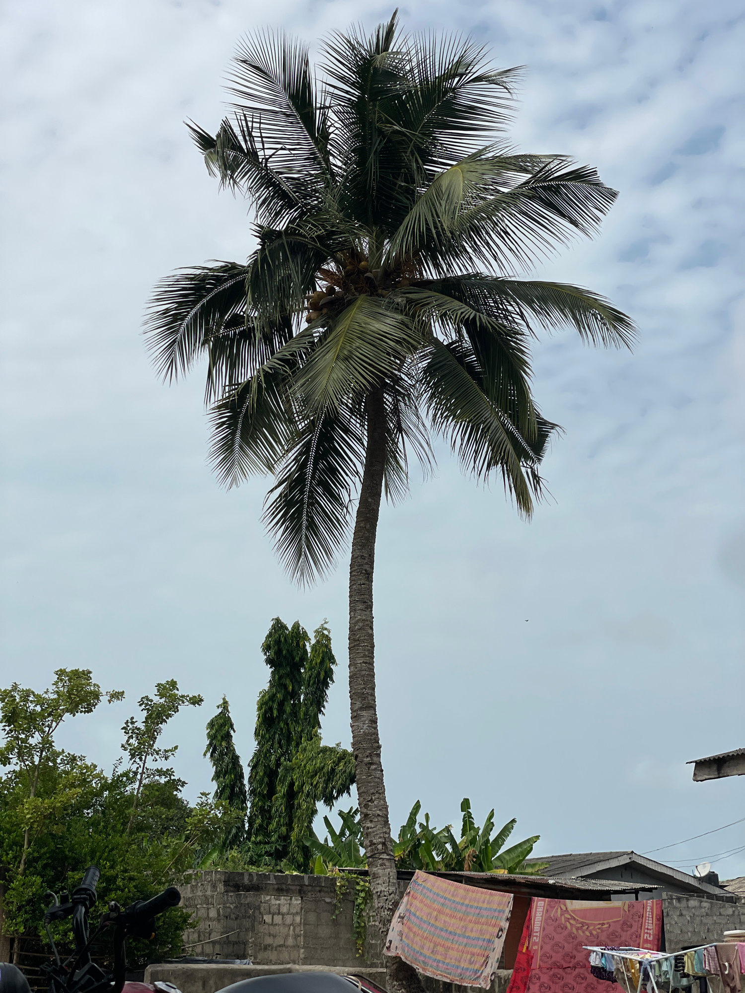 The image depicts a tall palm tree with dense foliage extending horizontally, set against a cloudy sky. Adjacent to the palm tree is a building of block construction with laundry hanging on a line. Va…read more