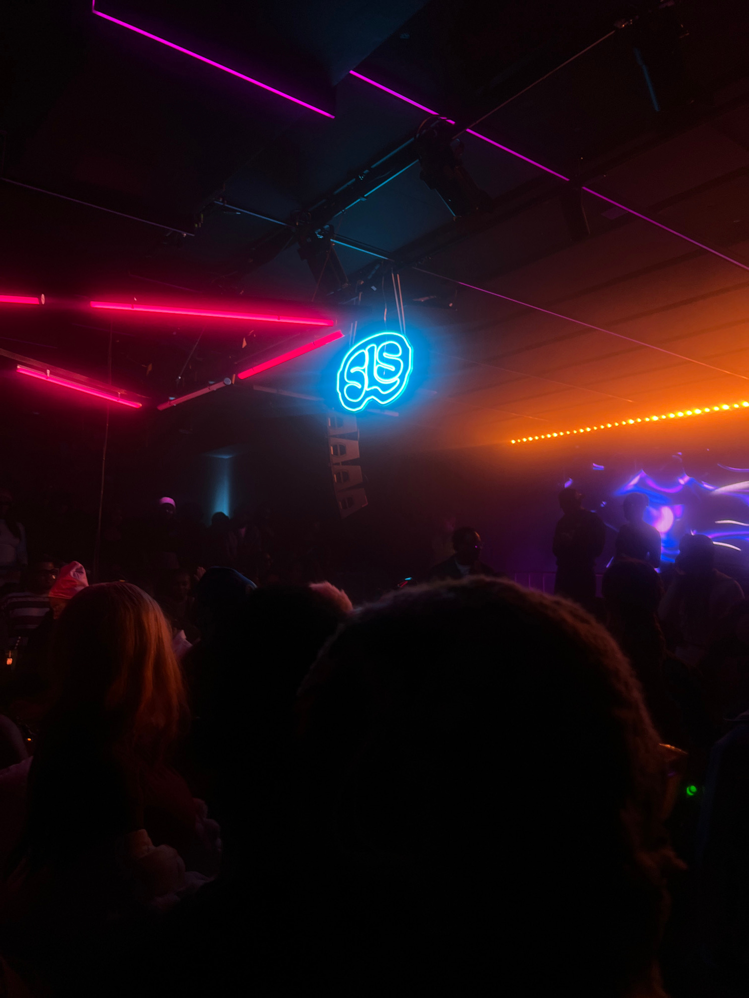 This image shows a dimly lit interior, possibly in Hemsedal, Norway, given the prompt. The scene is dominated by neon lights: pink vertical lines and a blue neon sign shaped like a brain. An orange li…read more