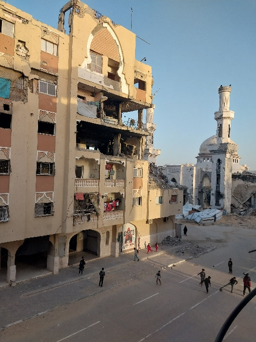 This image depicts a scene of extensive structural damage in Khan Yunis, Palestinian Territory. In the foreground and dominating the left side is a multi-story building, approximately six to seven flo…read more