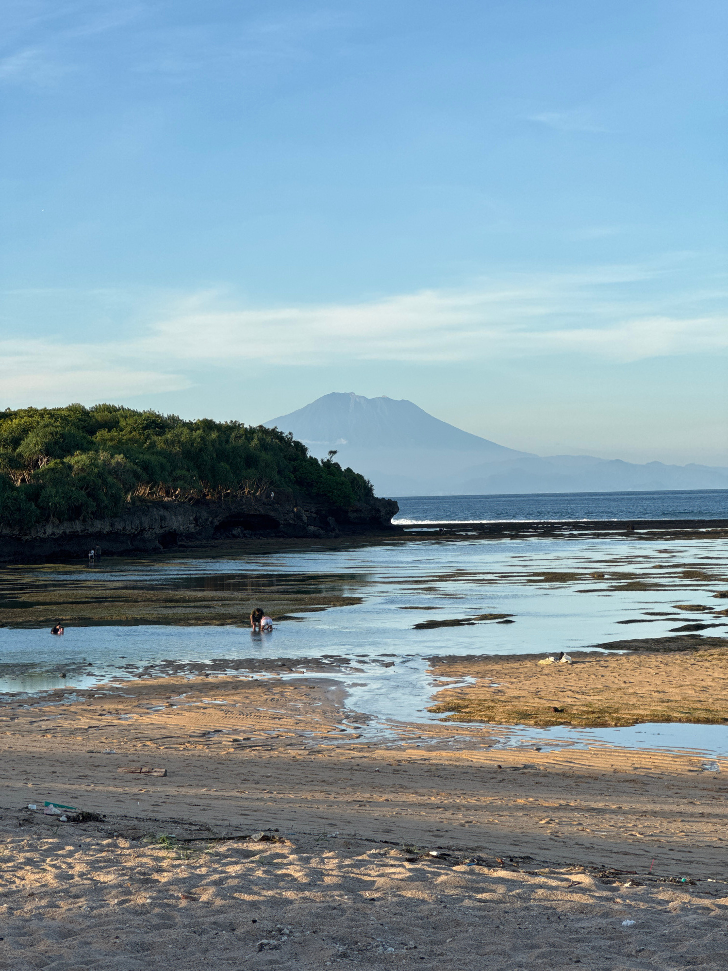 The image shows a beach scene in Kuta Selatan, Indonesia. The sky is a light blue with some wispy white clouds. To the left, there is an island covered in dense green vegetation, with a large mountain…read more