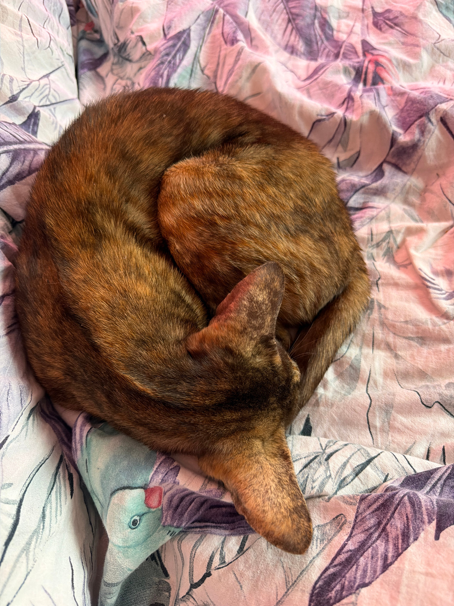 An overhead shot captures a domestic cat curled up tightly on a patterned fabric, likely a bed or blanket. The cat's fur is a short, mottled pattern of brown, black, and ginger hues, characteristic ofโฆread more
