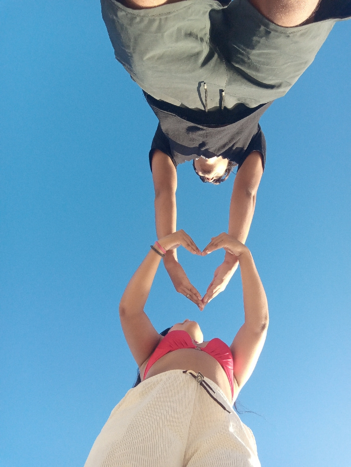 Two people, viewed from below against a cloudless blue sky, are making a heart shape with their hands. The person on top wears a black t-shirt and dark shorts, while the person below wears a pink biki…read more