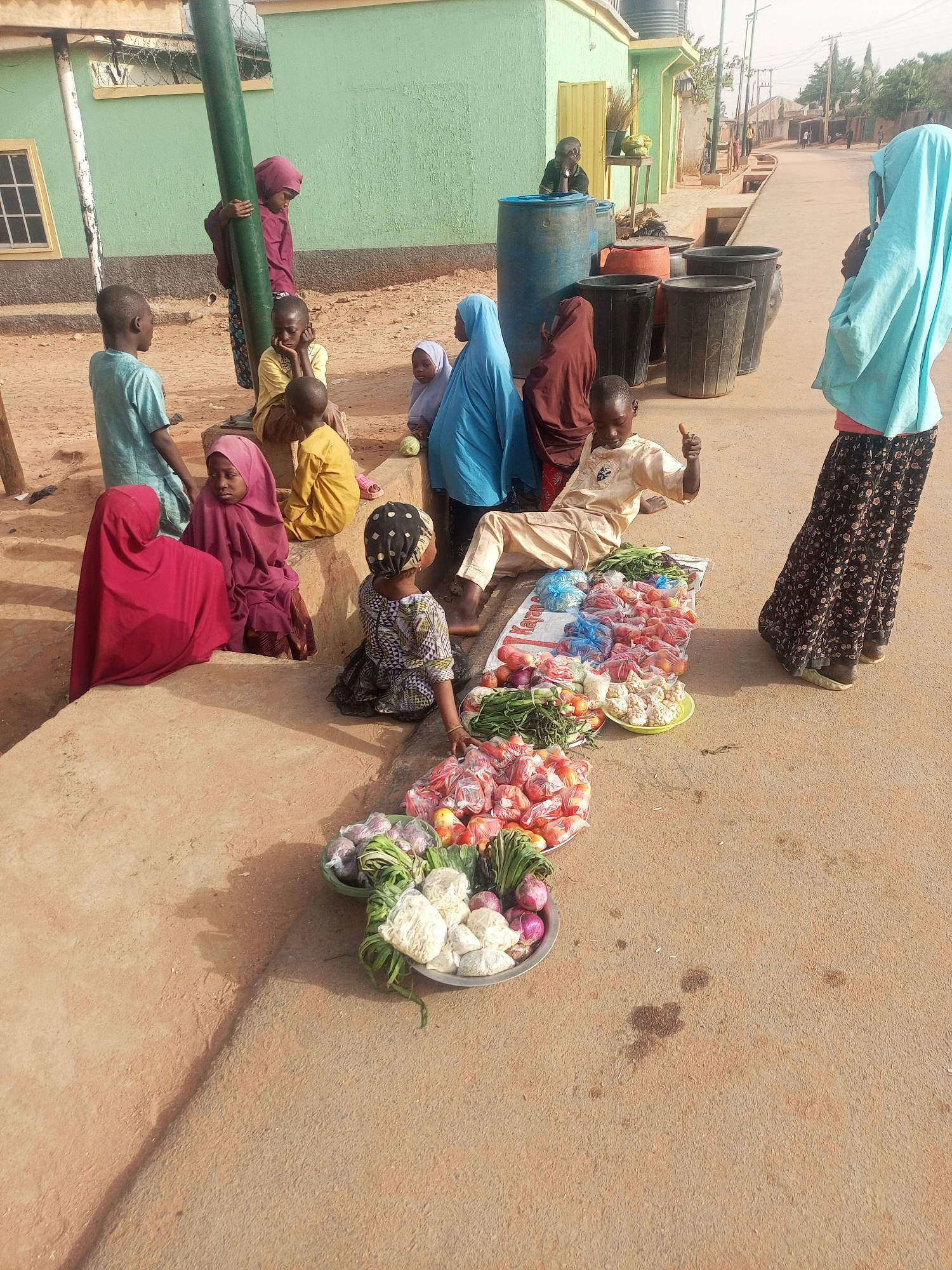 The image depicts a street scene in Timia, Niger, featuring a makeshift market stall. In the foreground and mid-ground, a group of approximately ten children and young adults are present on both paved…read more