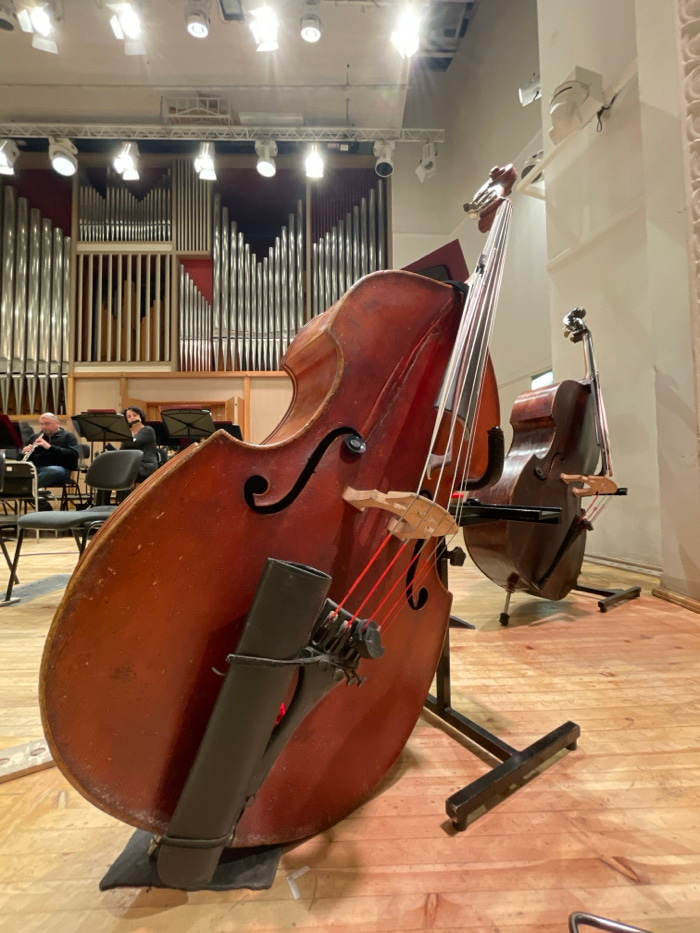 The image depicts a rehearsal or setup within the main concert hall of the Sverdlovsk State Academic Philharmonic Hall in Yekaterinburg, Russia. In the immediate foreground, a large, dark reddish-bro…read more