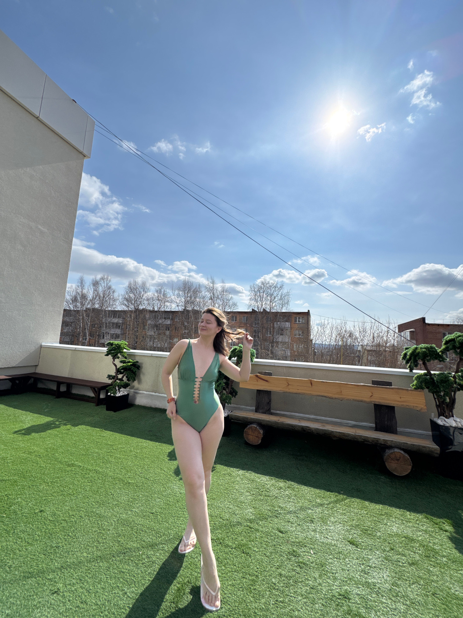 A woman is reclining on a rooftop covered with artificial turf. She is wearing a green swimsuit and white sandals. Her left arm is raised, and she is touching her hair. A wooden bench and a small pott…read more