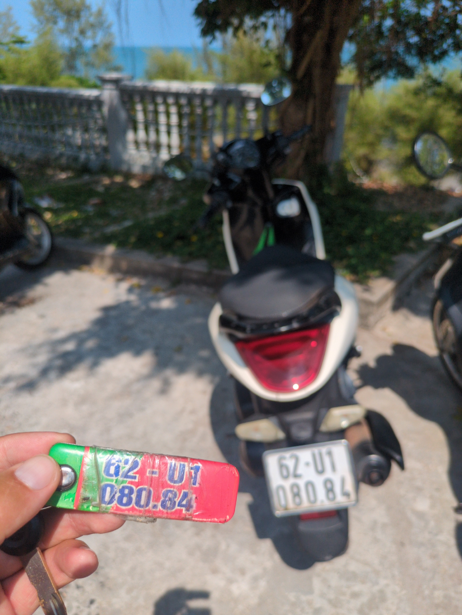 The image shows a person holding a key with the license plate number "62-U1 080.84" written on it. In the background, there is a moped/scooter with a license plate that also reads "62-U1 080.84." Ther…read more