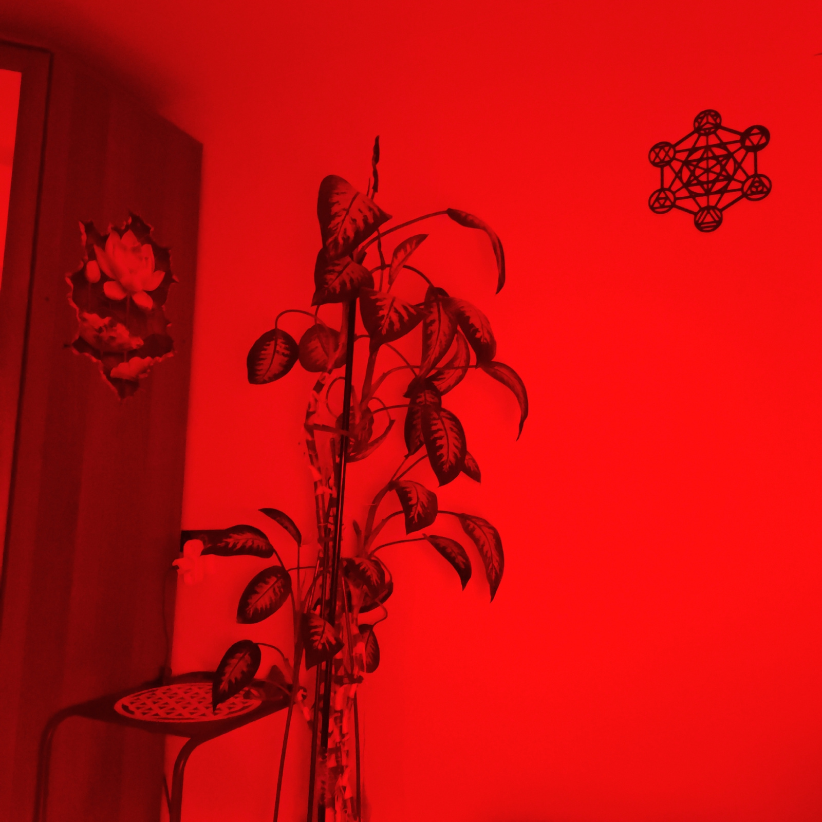 The image shows an interior scene illuminated by red light. A plant with large leaves is placed in a vase on a small, round table. On the wall to the left is a floral decoration, possibly a lotus. Toβ¦read more