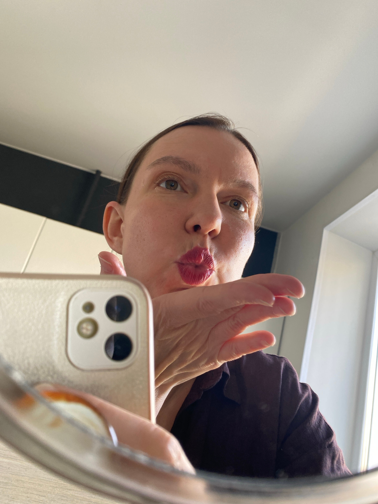 A woman is taking a selfie in a bathroom mirror. She is pursing her lips for the photo. The background includes a partially visible window and a wall with black and white tiles. She is holding a smart…read more