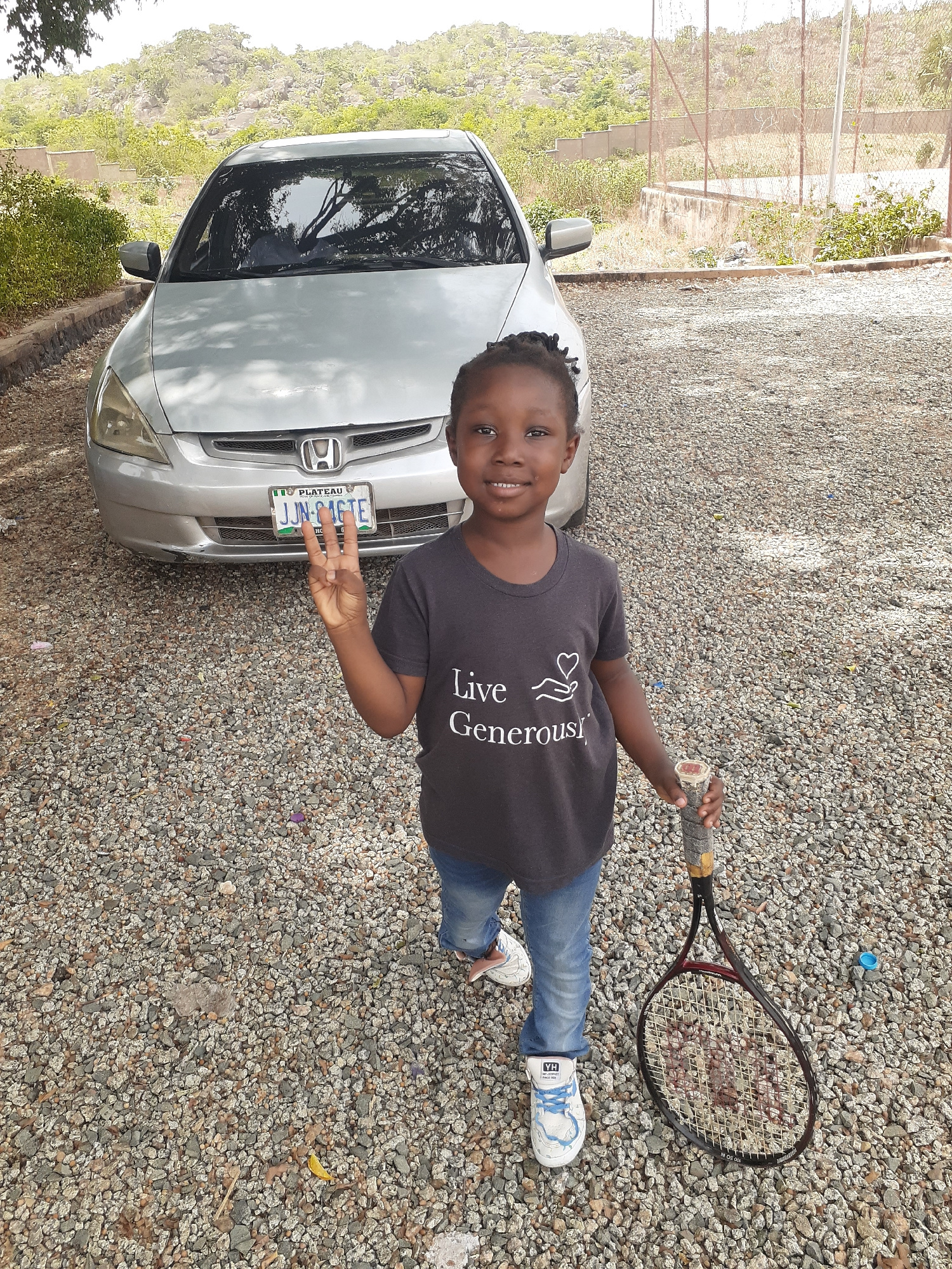 The image shows a young person standing next to a silver Honda car in an outdoor environment. The background suggests a rocky landscape, possibly in or near Jos, Nigeria. The person is holding a tenni…read more