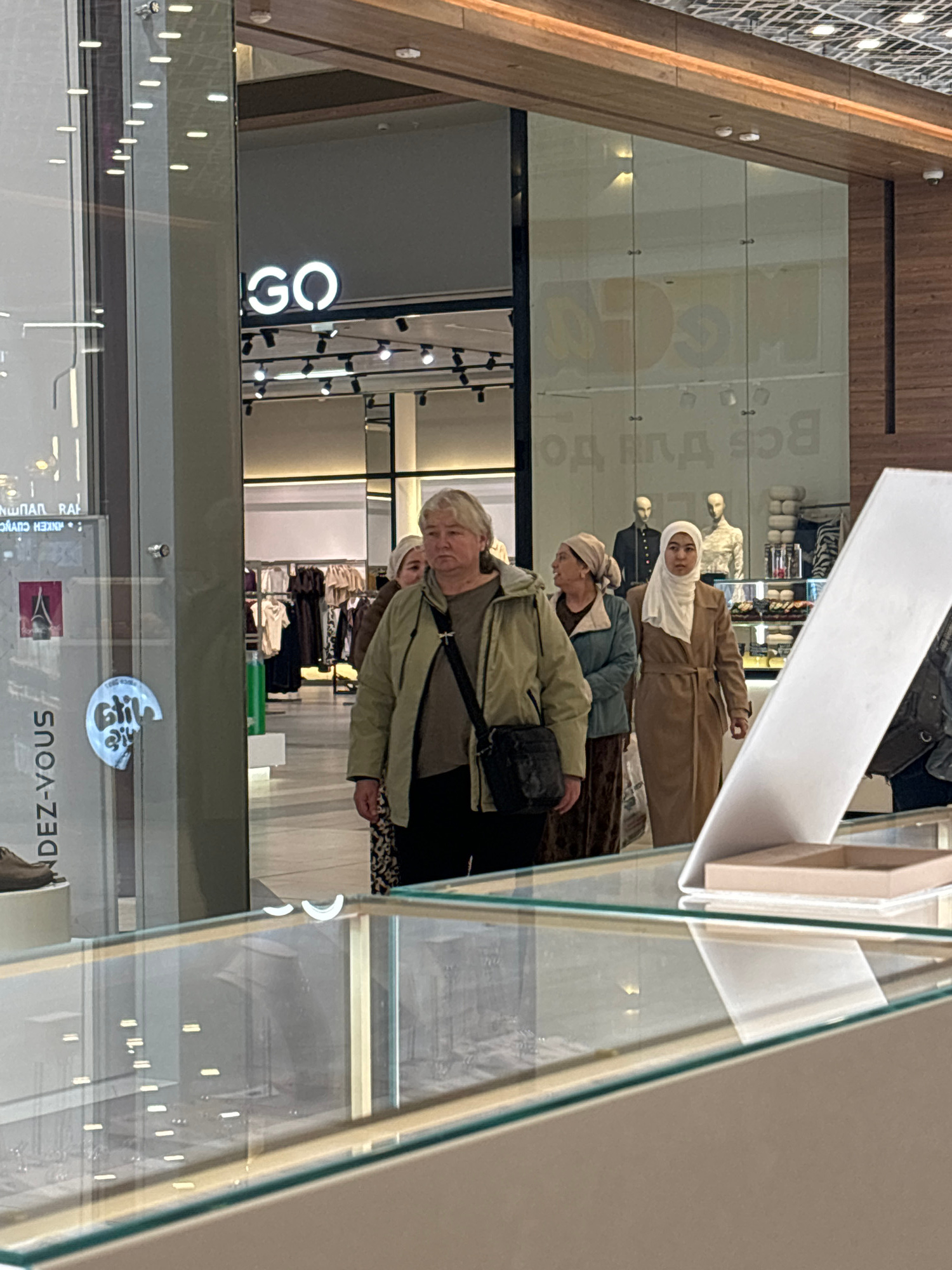 The image depicts an indoor scene likely inside a shopping mall in Yekaterinburg, Russia. In the foreground is a glass display case, and in the background are shoppers. At least three individuals are visible, including a woman wearing a head covering and another in a light green jacket carrying a black bag. Mannequins are visible in the background, behind the shoppers, in what appears to be a clothing store. Signs visible in the reflection on the glass include "SOUS-DEZ-VOUS" and a vertically oriented sign in Cyrillic script. Another sign that contains “GO” is seen on the window. | Open Wire