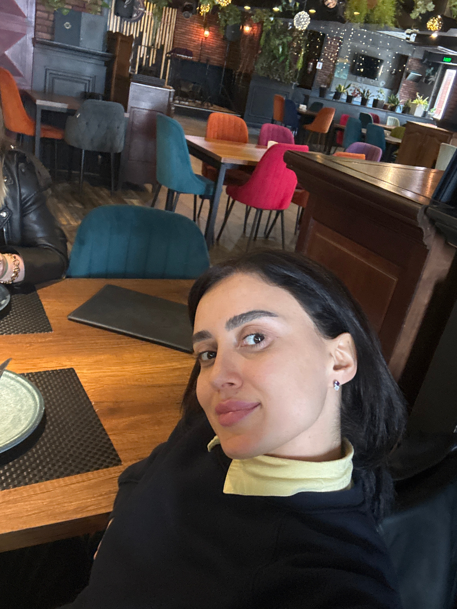 The image depicts a woman with dark hair sitting at a wooden table in what appears to be a restaurant or bar setting. She is wearing a black top with a yellow collar visible. A small earring is seen o…read more