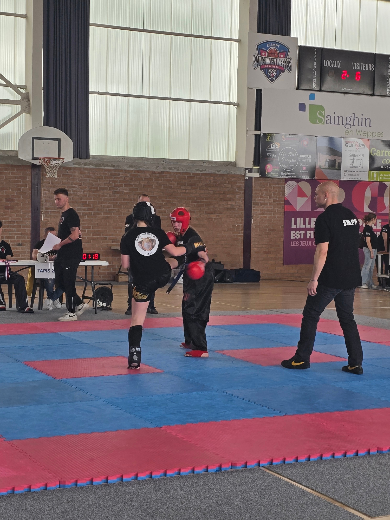 The image shows a kickboxing match taking place indoors, with two fighters engaged in combat on a blue and red mat. A referee in black clothing is standing near the fighters. A table with a timer set to 01:18 can be seen in the background, with a basketball hoop and scoreboard visible above. Signs on the wall indicate the location as Sainghin-en-Weppes, France, with advertisements for local businesses and sports clubs, including basketball and handball. Several other individuals are present, observing the match and taking notes. | Open Wire