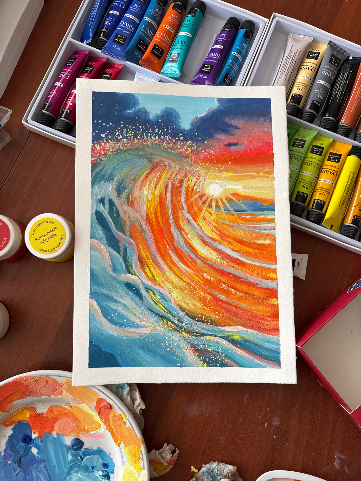 A painting of a swirling vortex is at the center of the image. The vortex transitions from fiery reds, oranges, and yellows at its core to cool blues and whites towards the outer edges. There's a brig…read more