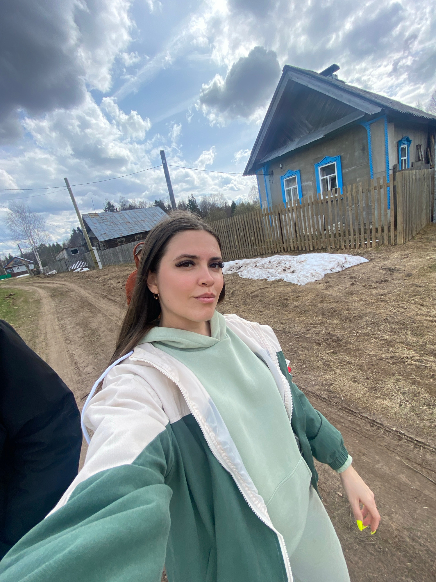 A woman with brown hair and brown eyes is positioned in the foreground of a horizontally rotated image. She is wearing a green and white tracksuit. Her left hand is extended with neon yellow nail poli…read more