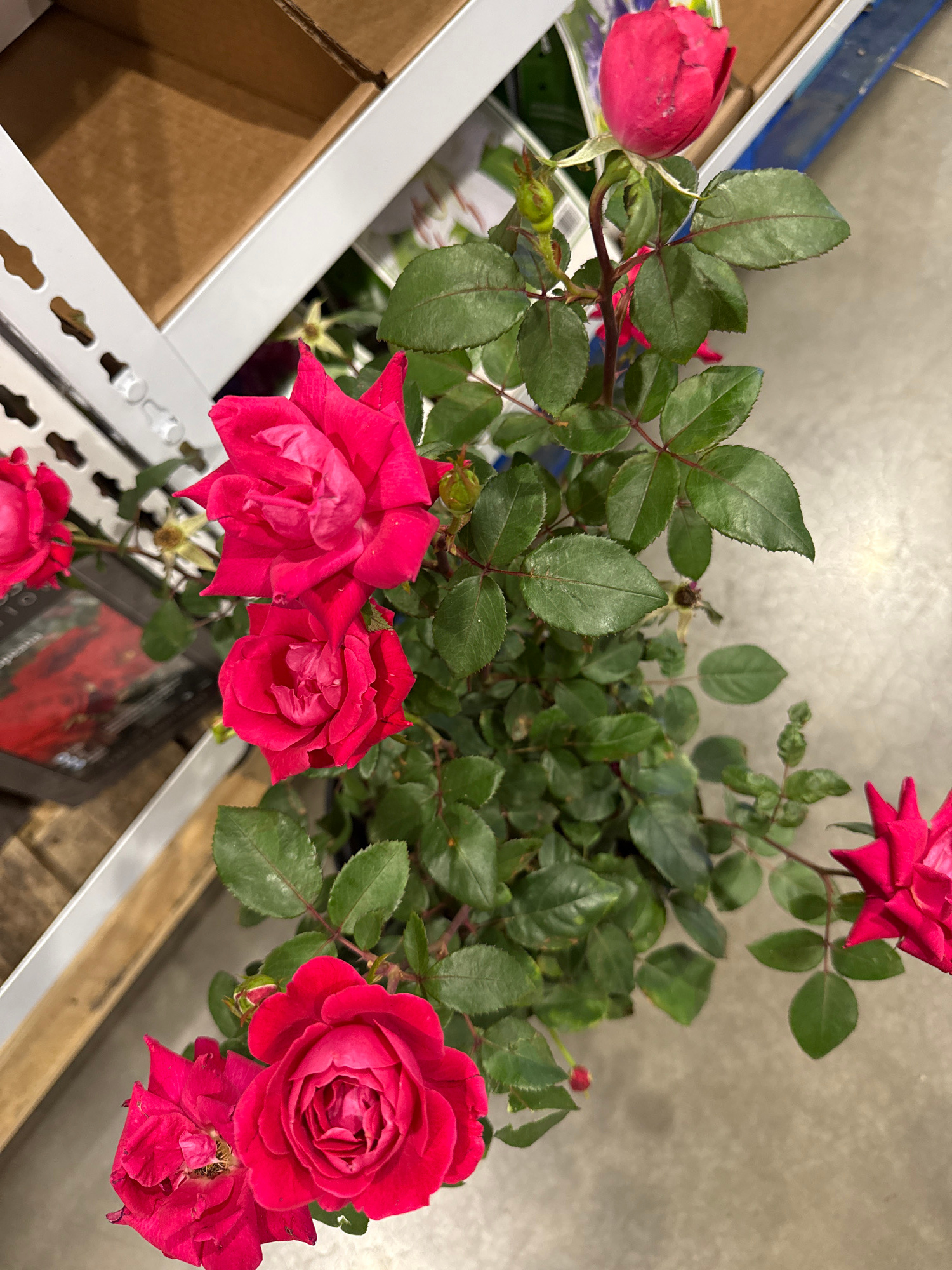 The image shows a potted red rose plant. The plant has several fully bloomed roses, rose buds, and green leaves. The pot is located within a shelving unit, surrounded by cardboard and metal frame supp…read more