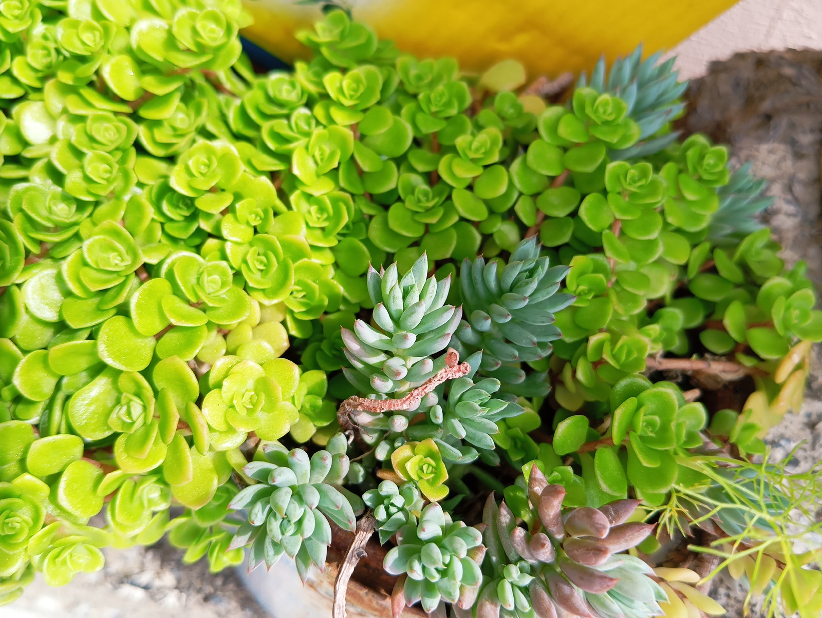 The image depicts a close-up view of various succulent plants, primarily green in color, clustered together in a container. The arrangement includes different species, some with tightly packed, rosett…read more
