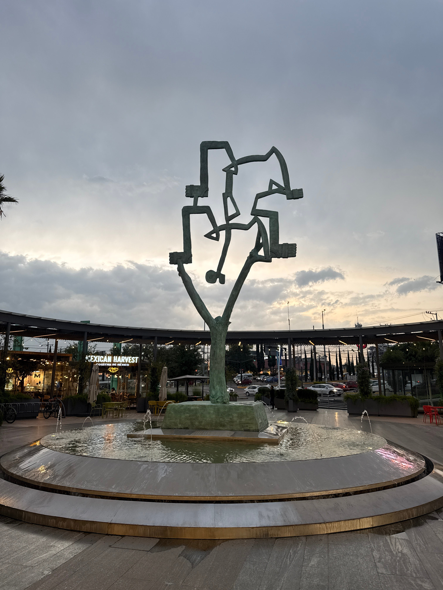 The image captures a scene in Puebla, Mexico, focusing on a public space featuring a modern sculpture and a round fountain. The sculpture, abstract in form, stands prominently against a cloudy sky. Ad…read more