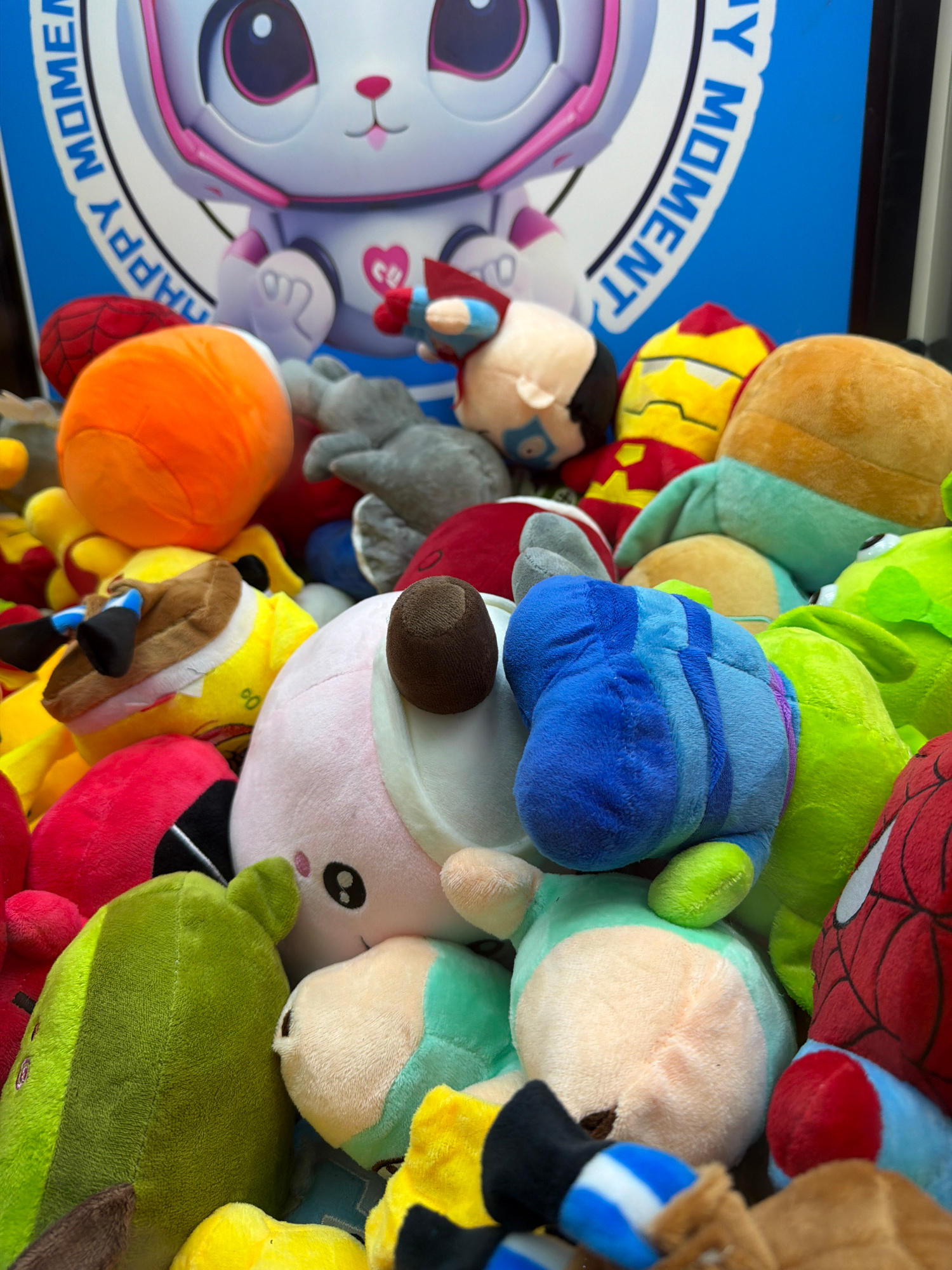The image presents a close-up, high-angle view of a dense pile of colorful plush toys, likely contained within an arcade claw machine in Sliven, Bulgaria. The toys are soft, fabric-based, and appear t…read more