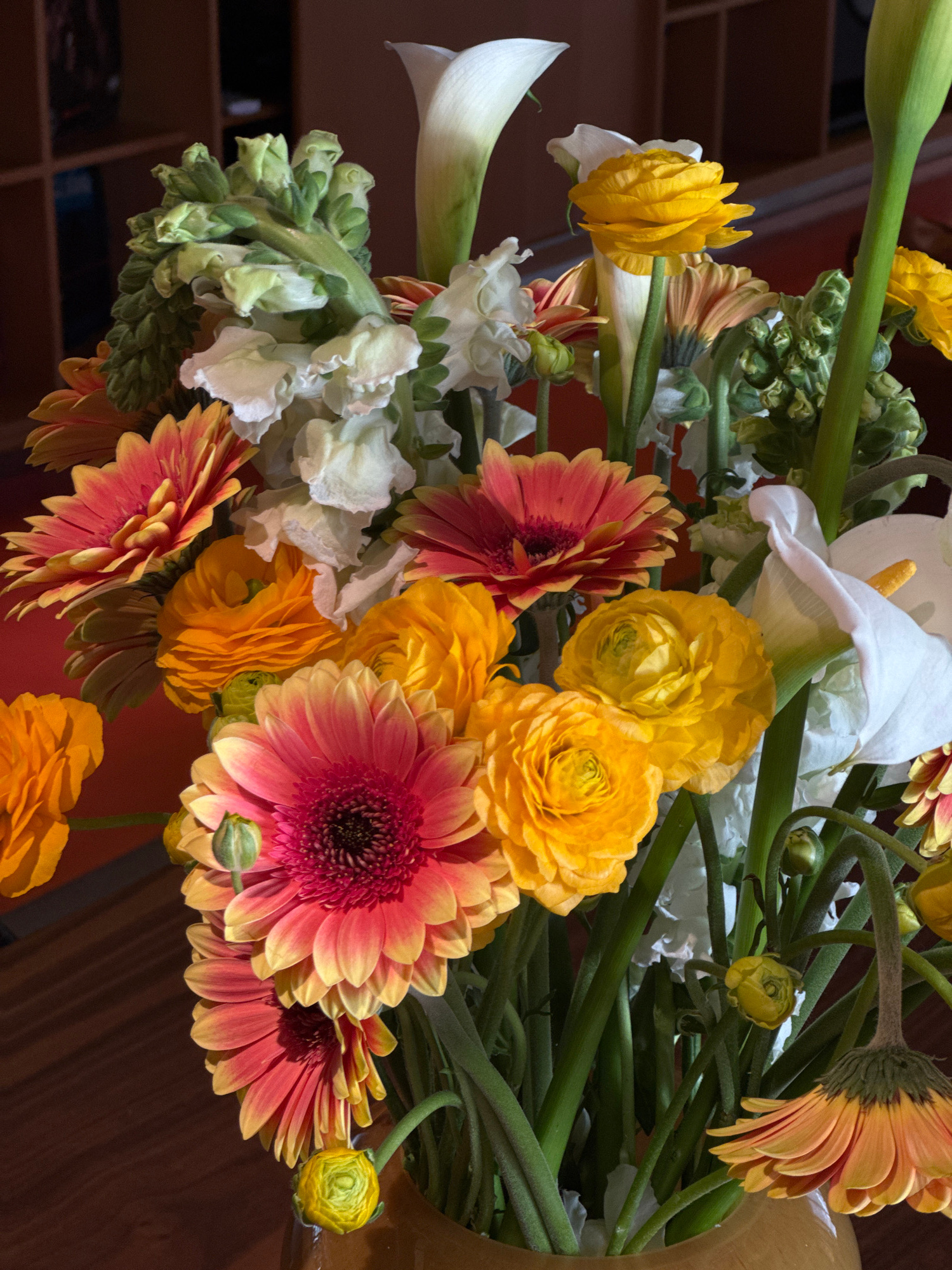 A close-up shot shows a bouquet of mixed flowers in warm tones. The bouquet includes white calla lilies, yellow ranunculus, and gerbera daisies with red and peach petals. Also included are stalks of u…read more