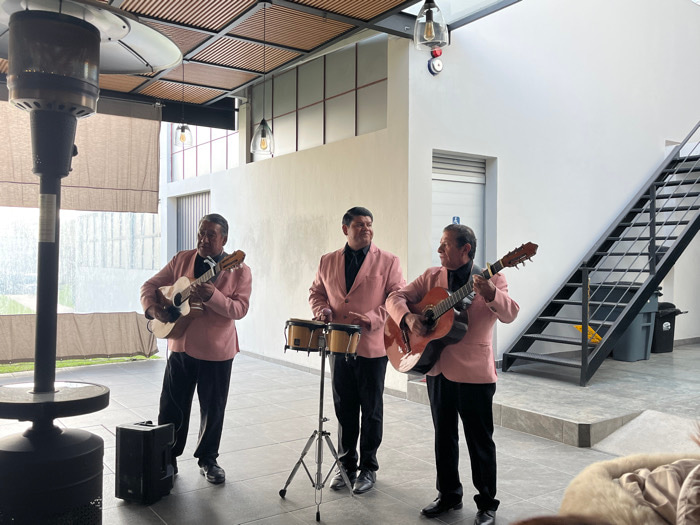 Three men are performing music in a modern, open-air space. They wear matching pink blazers and black pants. One plays a guitar, another a smaller stringed instrument, and the third is on percussion,…read more