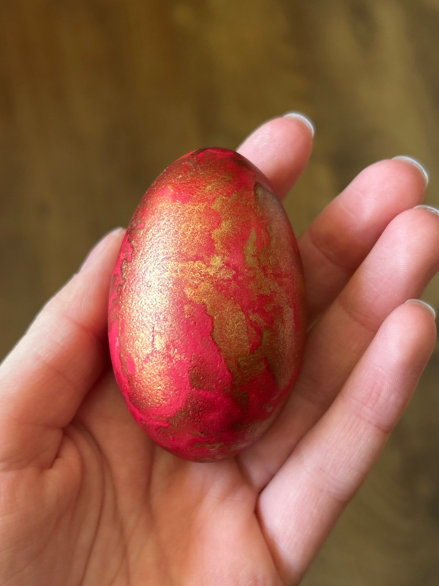 A hand holds a red and gold egg. The background is a blurry brown. The image does not show the city of Krumovo, Bulgaria.