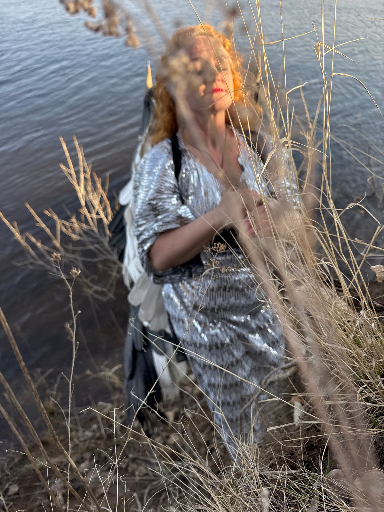 A woman with red hair and red lips is wearing a silver sequined dress and laying on the ground next to water. Dried reeds and grasses surround her. The location is likely near a body of water, and the…read more
