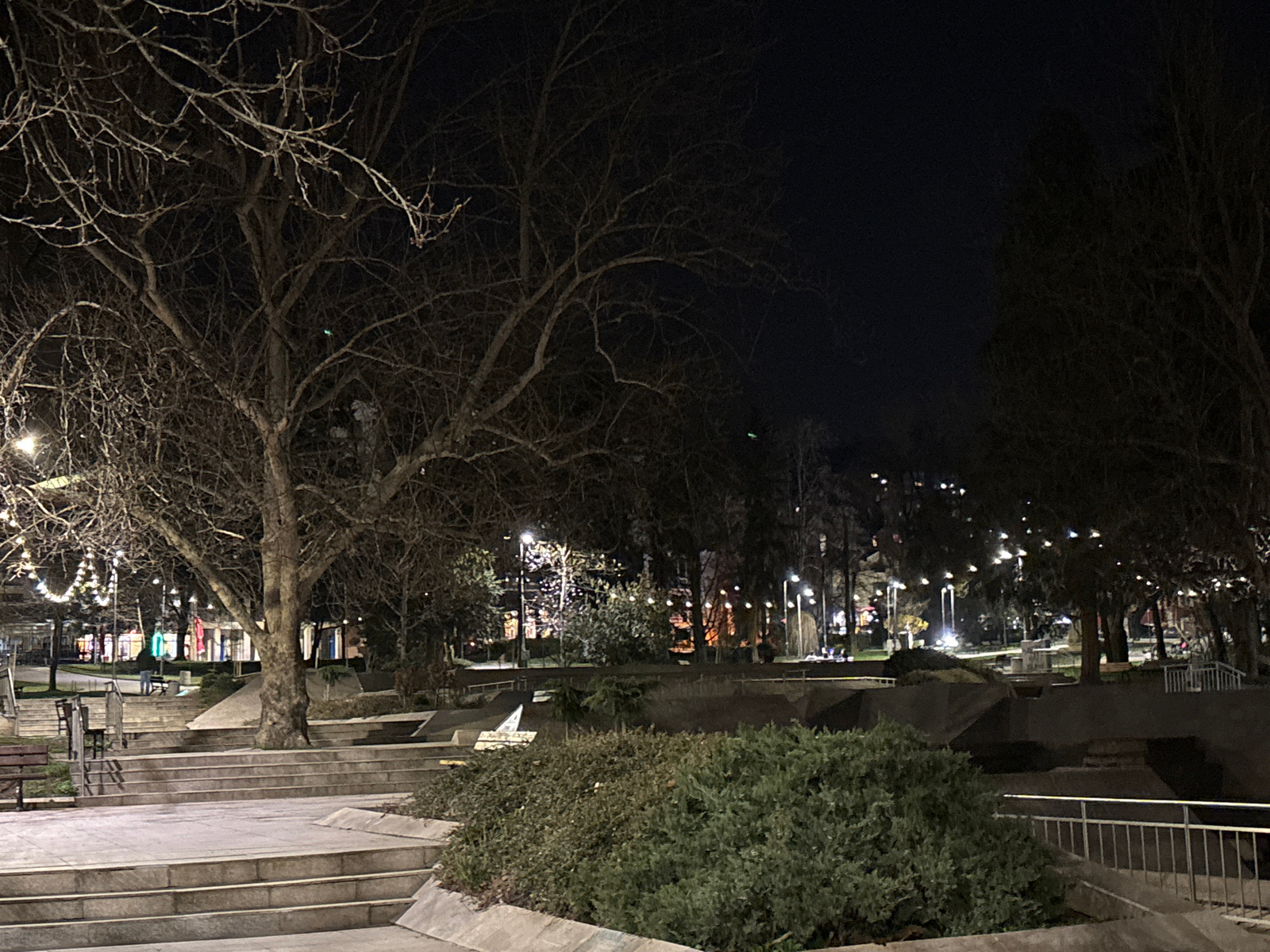 This nighttime image shows a park scene in Veliko Tarnovo, Bulgaria. Bare trees dominate the foreground and background, their branches silhouetted against the dark sky. String lights illuminate the pa…read more