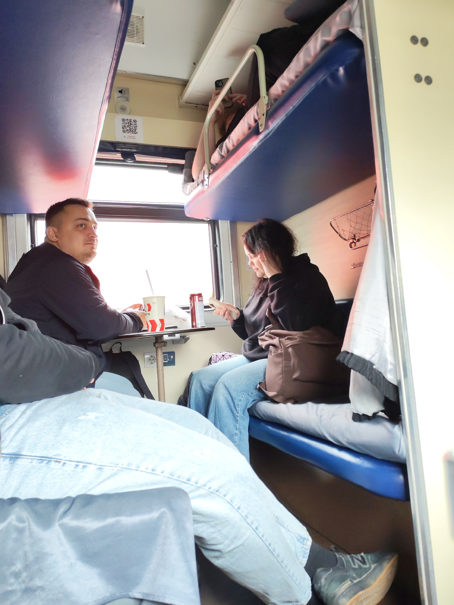 This image captures the interior of a train compartment, likely a Russian long-distance carriage, during daytime. Three individuals are visible. In the mid-ground, a man with short hair, wearing a dar…read more