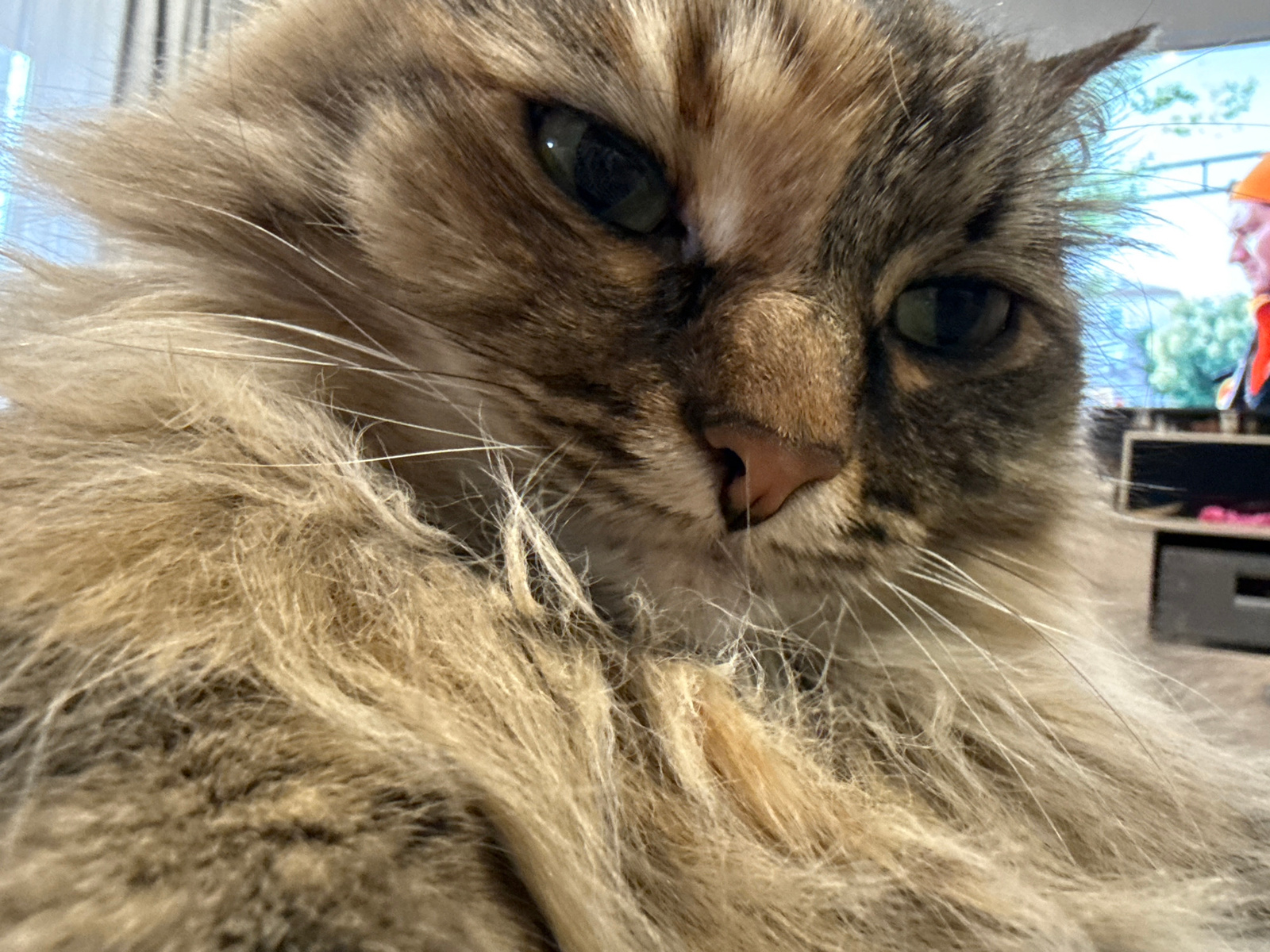 A close-up, upside-down view of a cat's face. The cat has green eyes, a pink nose, and long whiskers. Its fur is a mix of brown, gray, and tan. A blurred background reveals a glimpse of a television s…read more