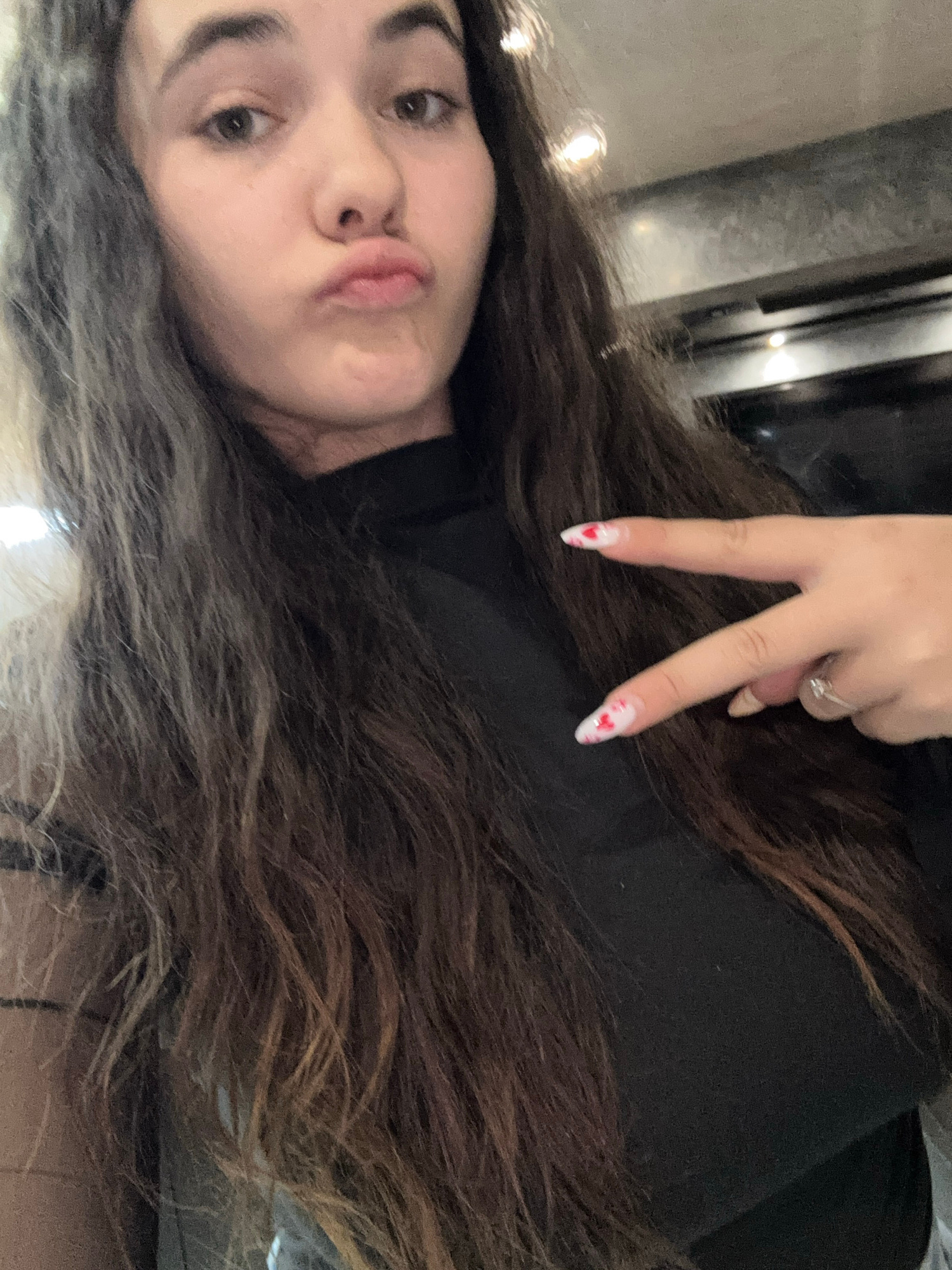 A young woman with brown hair is positioned in the foreground, partially tilted. She is making a kissing face towards the camera, and her left hand is raised, forming a peace sign, with the nails pain…read more