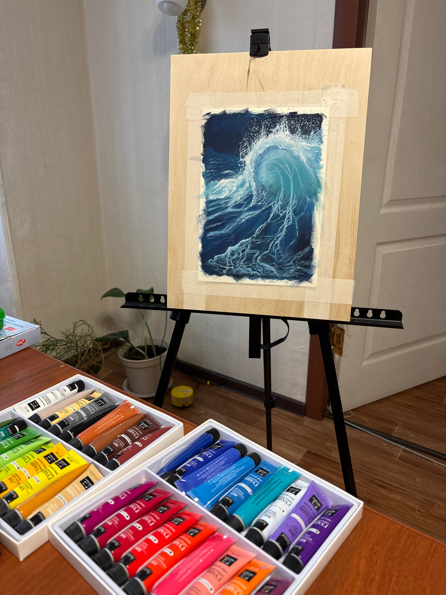 Here is a detailed description of the image: **General Scene:** The image shows an artist's workspace. A painting of a wave is mounted on an easel. To the side, there are two sets of gouache paintsβ¦read more