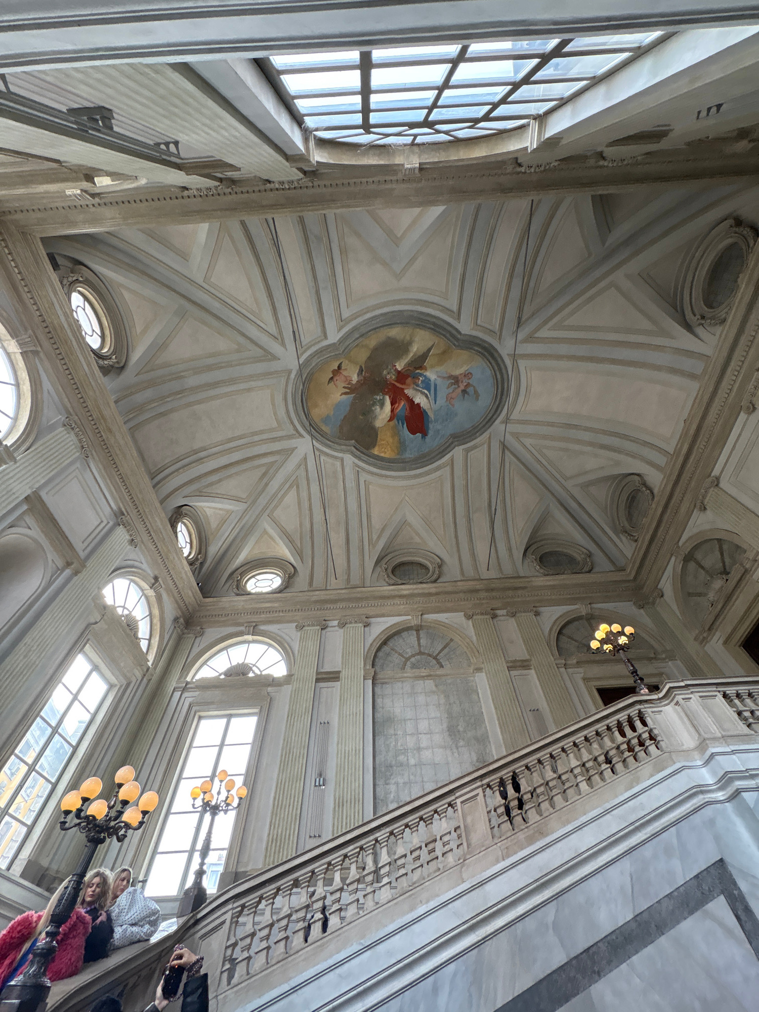 The image shows an ornate interior view looking upwards, possibly the ceiling of a building in Milan, Italy, based on the architectural style. The ceiling is primarily off-white with intricate geometr…read more