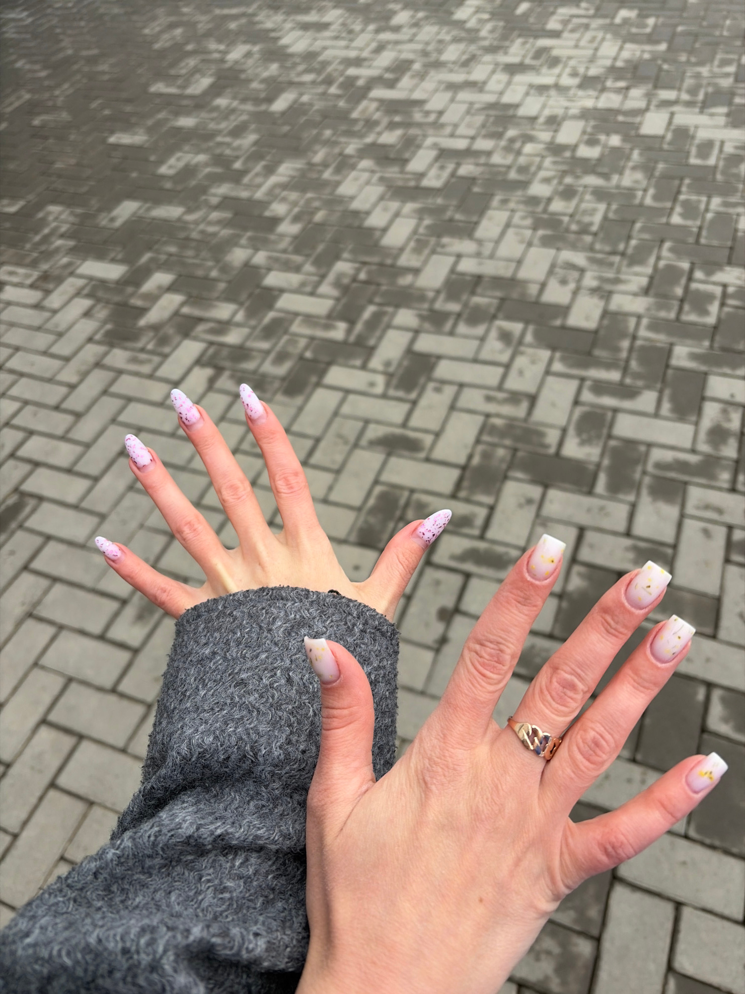 Two hands are displayed against a backdrop of a grey brick walkway. The upper hand, adorned with a gold ring on the ring finger, exhibits square-shaped nails with a white tip and gold flecks. The lowe…read more