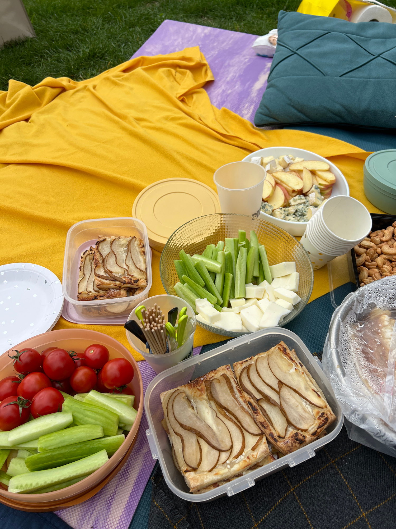 A picnic is laid out on a yellow and purple blanket on grass. There is a bowl of sliced apples and blue cheese, a stack of white paper cups, a bowl with celery sticks and cheese cubes, a container wit…read more