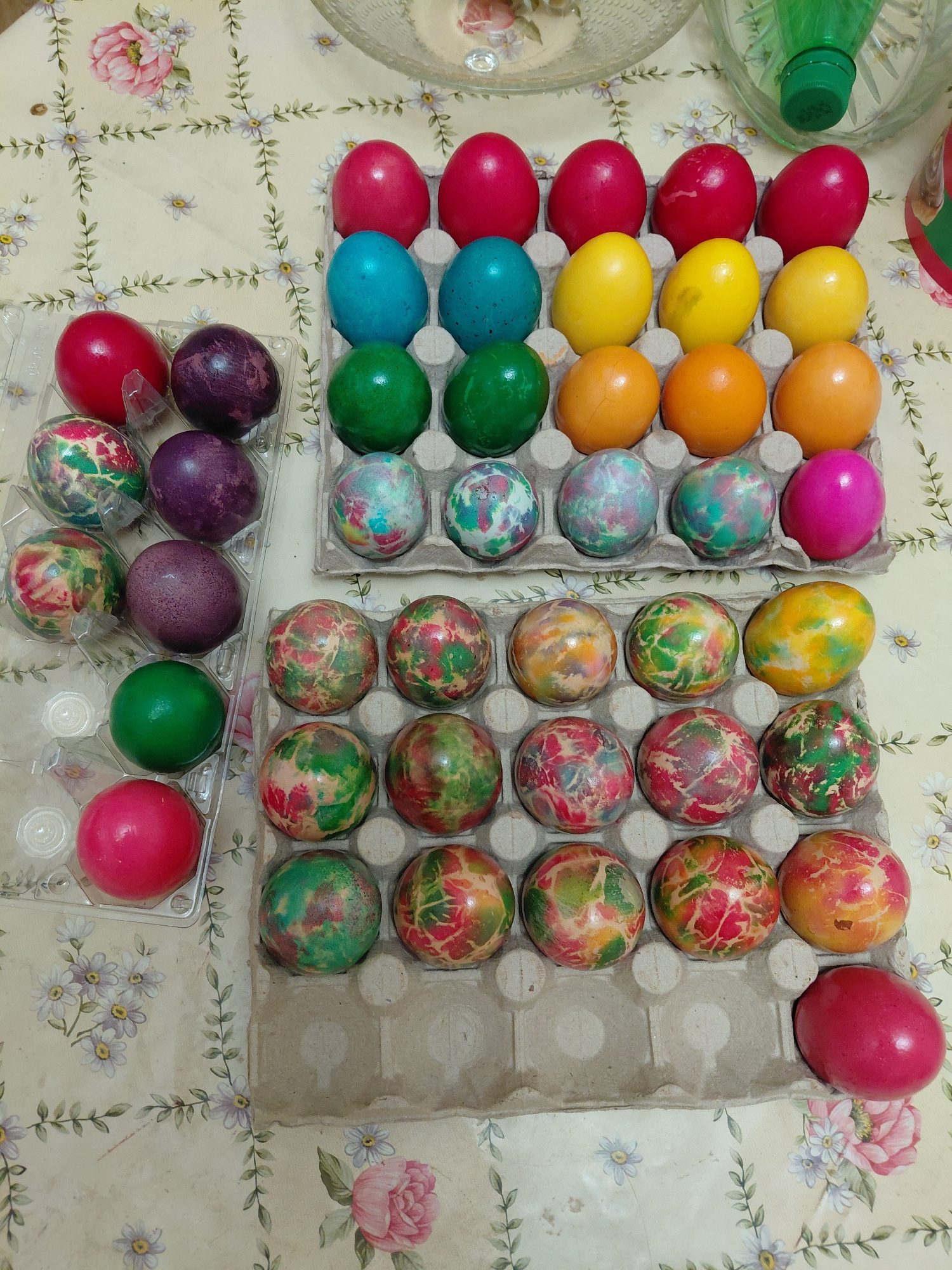 The image shows an arrangement of dyed Easter eggs on a floral-patterned tablecloth. The eggs are sorted into two cardboard egg cartons and one plastic container. The first carton contains rows of sol…read more
