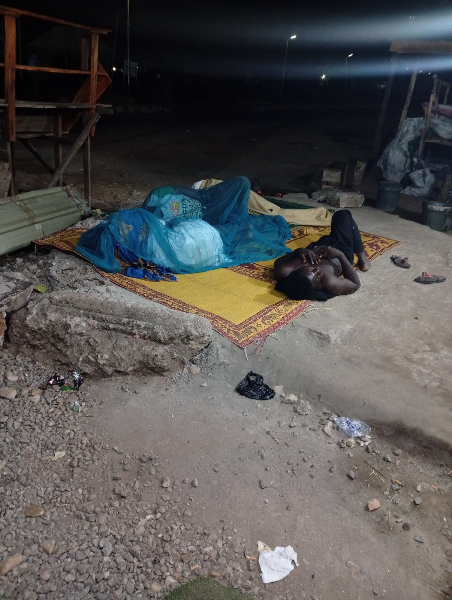 The image depicts an outdoor scene in Adankolo, Nigeria, at night. A shirtless man is lying on a yellow and red patterned mat, dressed in black pants. Next to him are two pairs of sandals. Adjacent to…read more
