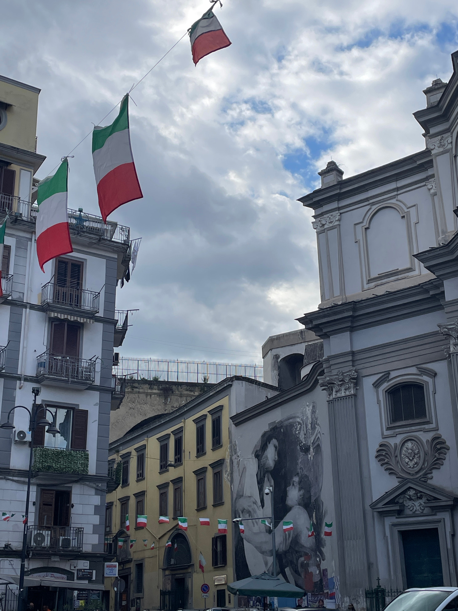 The image depicts an urban street scene in the Quartieri Spagnoli of Naples, Italy, under a partially cloudy sky. Numerous Italian flags (green, white, and red vertical stripes) are suspended on wires…read more