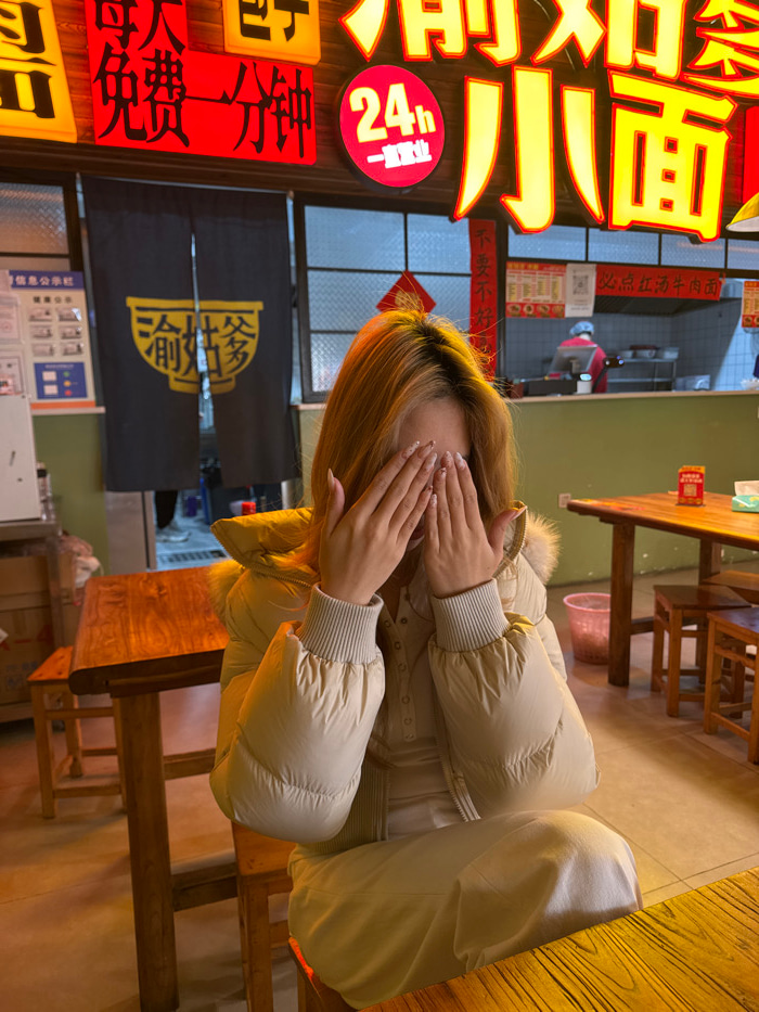 A person in a cream-colored puffer jacket sits at a wooden table, covering their face with their hands. In the background, bright neon signs illuminate a restaurant, advertising "24-hour" service and…read more