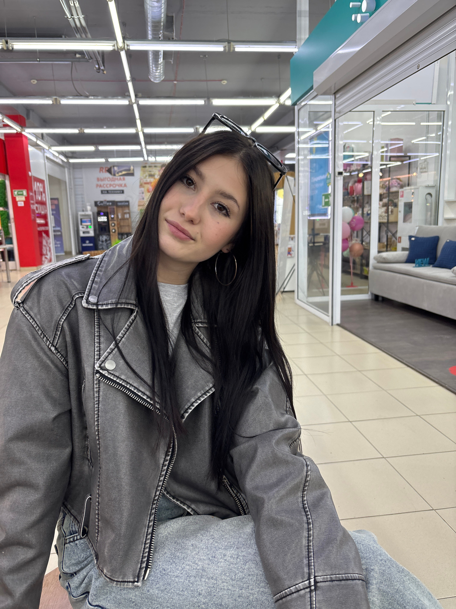 The image shows a young woman with long dark hair, wearing a gray jacket and jeans. She is positioned inside a store in Chaikovsky, Russia. The store appears to be a retail establishment with shelving…read more